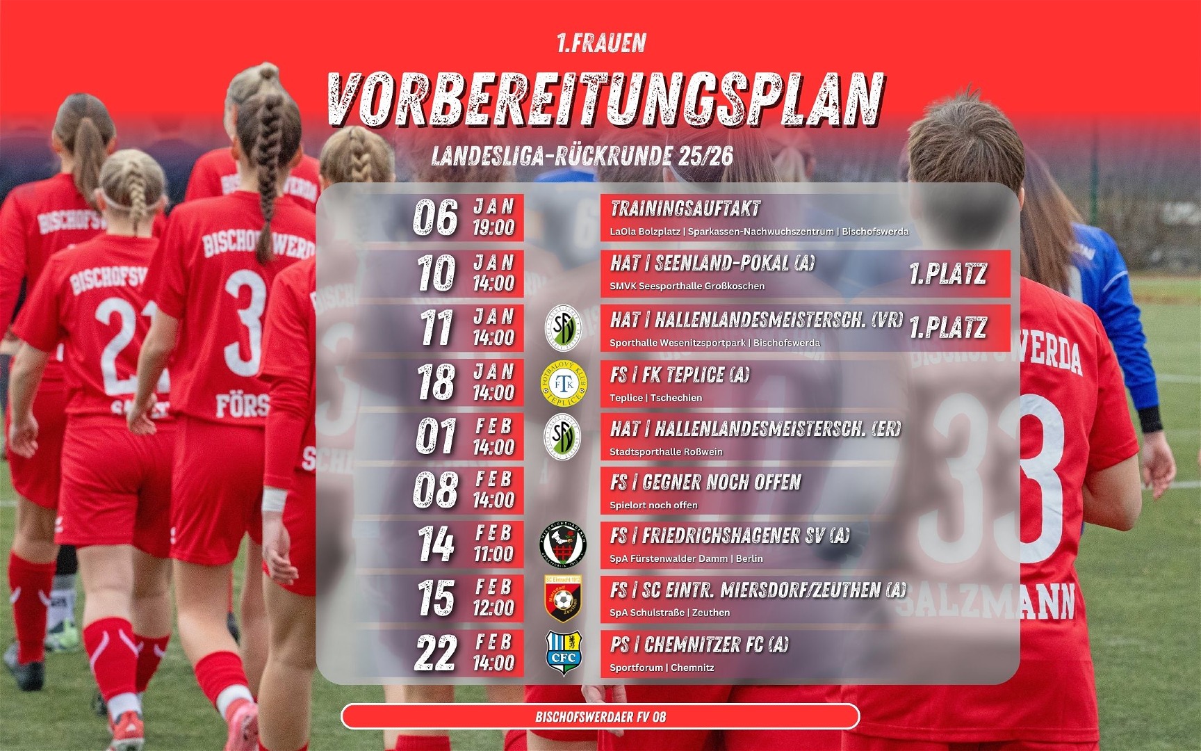 Auch wenn noch ein/zwei Termine final geklärt werden müssen, gibts hier den Plan für die kommenden Wochen bis hin zum Pflichtspielauftakt beim Nachholer gegen den Chemnitzer FC am 22. Februar 2026.